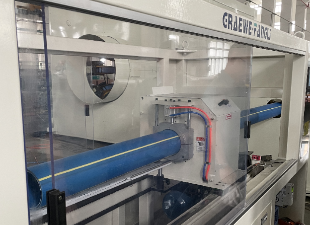 For det fjerde blir røret trukket av larvetrekkenheten og sendes inn i kutteren hvor røret kuttes av i henhold til den forhåndsinnstilte lengden; samtidig fjernes skjærestøvet av støvfjerneren.